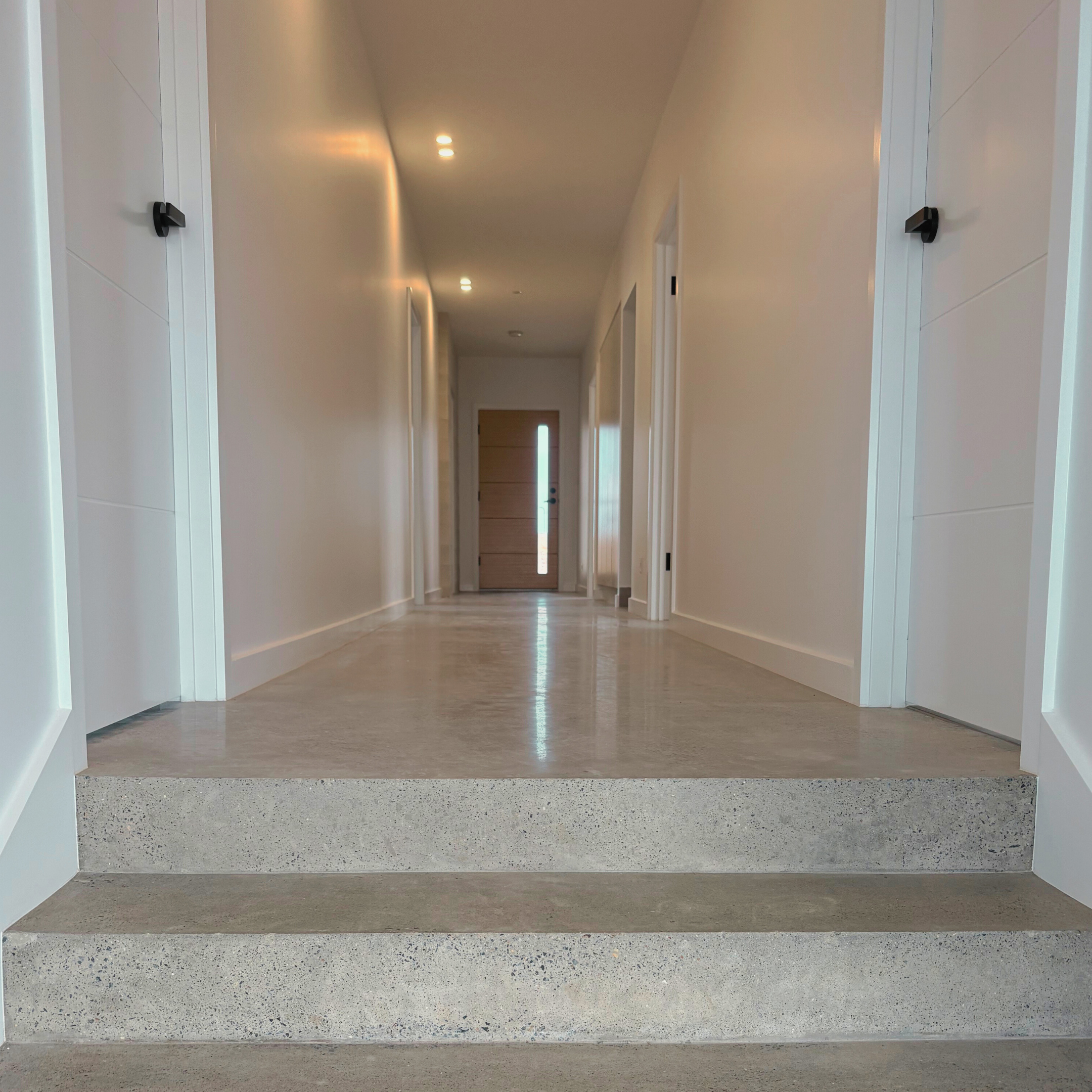 This was a unique project, with the clients living interstate throughout the build. They visited the site just once to check on progress, so you can imagine their excitement and delight when they finally moved into their dream home. Standout features of this project include textured black double-glazed windows, salt-and-pepper polished concrete floors, and a gas-lift window servery.